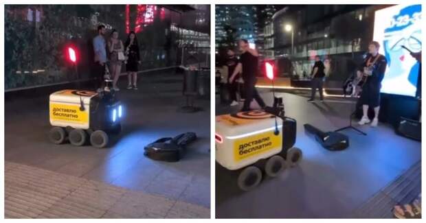 Робот-доставщик остановился возле уличного музыканта. Со стороны всё выглядело так, будто робот сделал перерыв и решил послушать музыку.