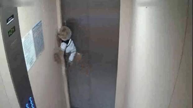 Хозяйка животного вышла из кабины с поводком в руках и не заметила, что питомец остался внутри. Двери закрылись, лифт тронулся, и собачка повисла на том самом поводке.