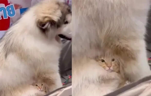Домашний кот нашёл убежище в густой шерсти своего большого друга.