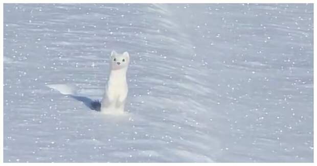Горностай наслаждается зимней прогулкой. Очаровательный хищник!