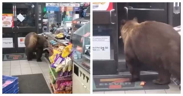 Медведь решил наведаться в магазин. Косолапый взял понравившуюся ему еду и отправился по своим делам.