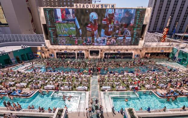 В Лас-Вегасе есть место, которое совмещает в себе бассейн, спорт-бар и стадион. Прямо из бассейна посетители могут наблюдать за спортивными матчами, балуя себя коктейлями.