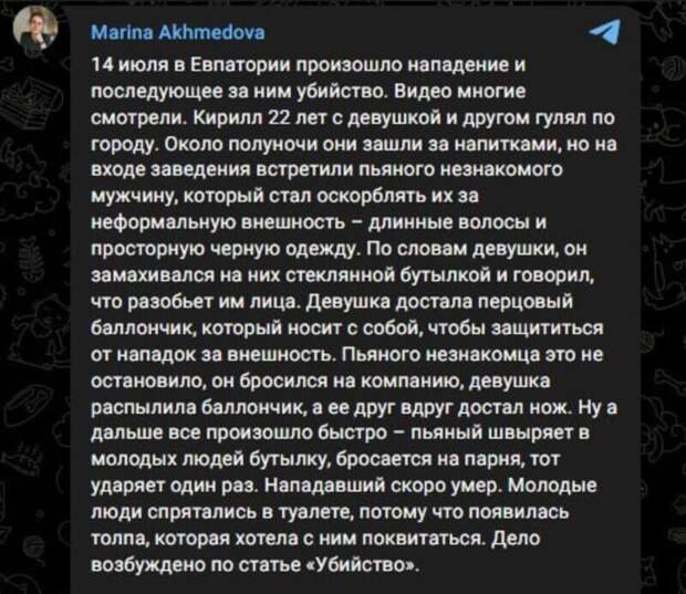 Марина Ахмедова, член Совета по правам человека при президенте РФ, сообщает, что погибший в Евпатории Эреджеп Мемишев, который предъявил претензии зумерам за внешний вид, оказался ваххабитом.