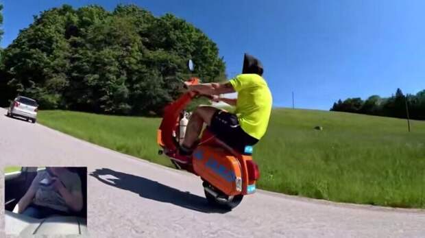 Австрийский каскадер Гюнтер Шахермайр прокатился 4.5 километра на скутере без переднего колеса. Всё это время у него на голове был мешок.