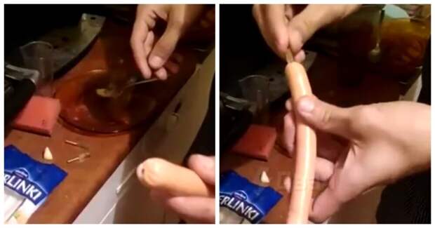 Житель Польши продемонстрировал необычный метод приготовления сосиски. Польские кулинарные технологии в действии.