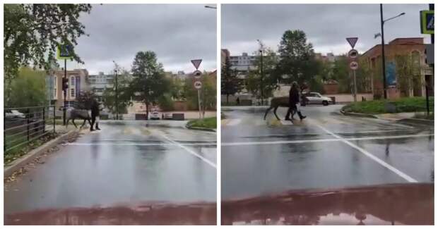 Ничего необычного, просто олень переходит дорогу по пешеходному переходу в Тынде.