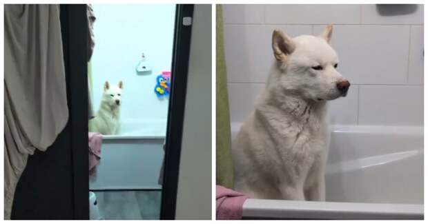 Женщина вывела своего пса на прогулку, а после возвращения домой забыла его помыть. Пёс залез в ванну и терпеливо ждал, пока хозяйка вспомнит о нём и помоет.
