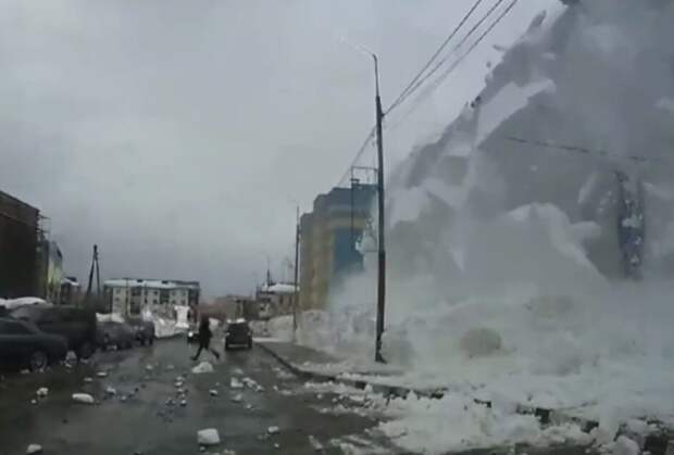 На Сахалине снежная масса сошла с крыши дома прямо на проезжую часть. Очевидец случайно успел заснять этот момент на видеорегистратор. На кадрах видно, как проходивший мимо мужчина успел за считанные секунды увидеть летящую на него снежно-ледяную массу и отбежать в сторону.