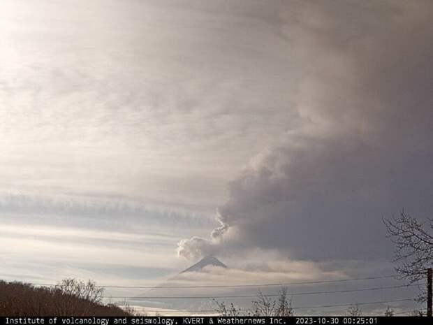 Ключевской выбросил столб пепла на высоту до 8 км. Лава изливается по двум желобам.