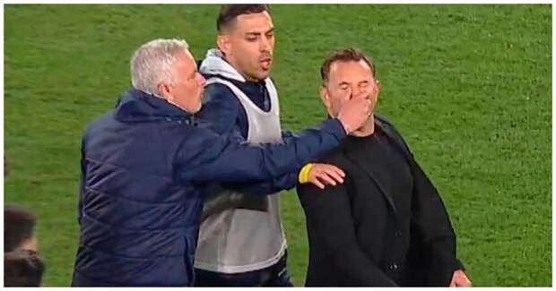 Глава турецкого футбольного клуба "Галатасарай" Окан Бурук упал на газон и начал корчиться от боли после того, как его попытался схватить за нос португальский тренер Жозе Моуринью. Курьезный эпизод попал на видео.