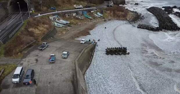Пляж в Хакодате, префектура Хоккайдо, побелел от рыбьих костей. В прошлом декабре тысячи тонн мертвой рыбы выбросило на берег. Многие связали случившееся с выбросом в океан очищенной воды с атомной станции Фукусима.