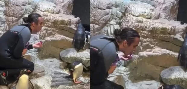 Сотрудник зоопарка развлекает пингвинов, устраивая для них мини-шоу с мыльными пузырями.