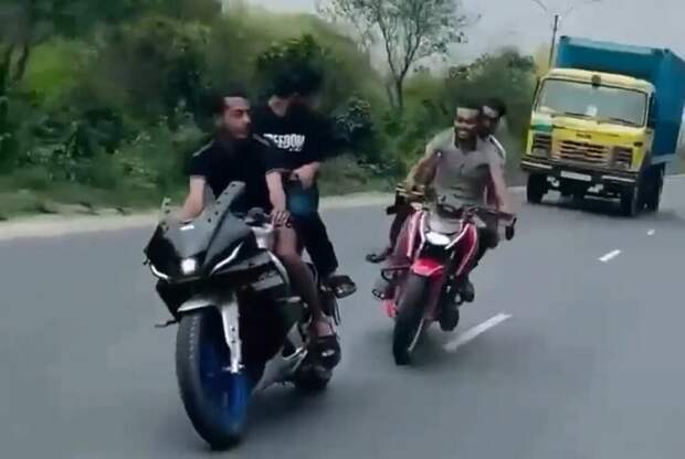 Выкрутасы на дороге до добра не доводят, особенно если ехать на мотоцикле и без экипировки. Индия. Как вам командная работа?