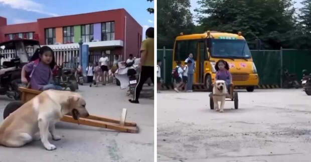 По словам очевидцев, отец соорудил для своей дочери мини-колесницу, и теперь каждый день этот пушистик выполняет особую миссию — сопровождает хозяйку во время пути из школы.