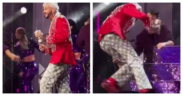 Филипп Киркоров упал во время своего выступления на «Новой Волне» в Казани. К певцу сразу же бросились танцоры и подняли его.
