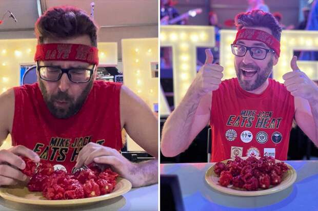 Мужчина съел 25 перцев чили за 4 минуты 36,26 секунды. На видео Майк поедает перцы и часто зажимает рот кулаком, чтобы не выплюнуть его.