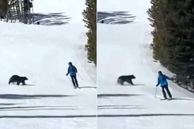 В США медведь выбежал из леса на курорте в штате Колорадо. Зверь бросился к другим деревьям, которые находились по другую сторону лыжни.