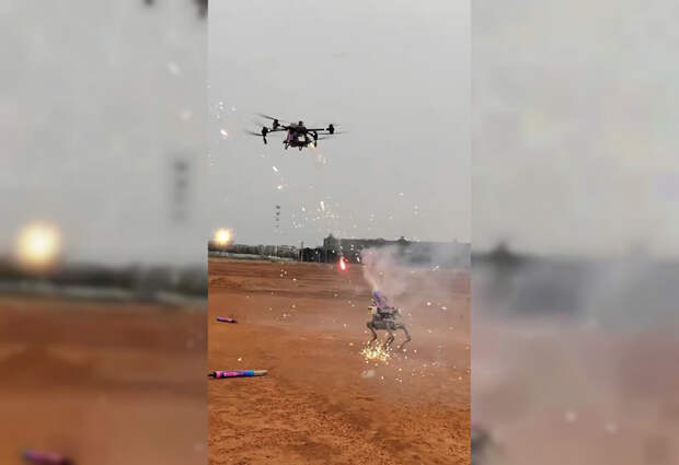В Китае энтузиасты провели короткий, но зрелищный поединок между дроном и роботизированным псом. Дрон и ропопёс устроили перестрелку пиротехническими изделиями.