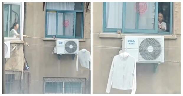 Женщина пыталась снять высохшую одежду с веревки, но у ветра были другие планы.