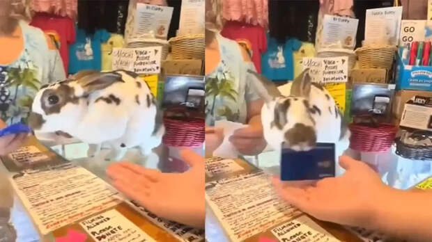 На кассе этого магазина покупателей обслуживает милейший кролик. Он аккуратно передает покупателю банковскую карту и чек, словно делает это строго по инструкции, выученной с морковкой в лапах.