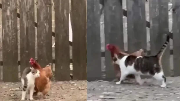 На видео попал кот с весьма необычными предпочтениями. Ему чем-то приглянулась курица и он начал "приставать" к ней.