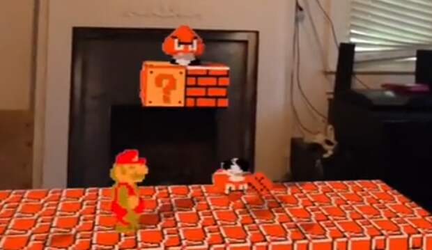 Как выглядит знакомая многим игра про водопроводчика Марио в шлеме виртуальной реальности . Игра запущена с помощью NES-эмулятора, который конвертирует классические 2D-игры в 3D-формат.