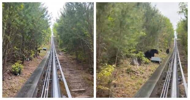 Автор видео пережил несколько тревожных моментов, катаясь на аттракционе в лесистой местности. Медведи неожиданно вышли из-за деревьев и сделали поездку незабываемой.