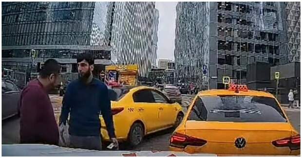 Автомобильный регистратор запечатлел конфликт двух водителей такси в "Москва-Сити". Словесная перепалка быстро переросла в драку.