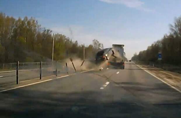 В Подмосковье на Минском шоссе водитель тягача пытался перестроиться в правую полосу и не заметил легковушку. От удара легковой автомобиль выполнил невероятный акробатический трюк. О пострадавших не сообщается.