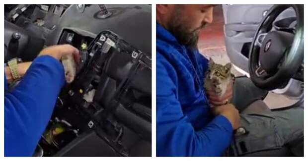 Мужчина пришёл на помощь застрявшему котёнку. Девушка запечатлела момент спасения любопытного котика.