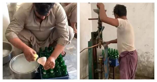 Видео с пакистанской подпольной фабрики, где мужчины разливают подделки популярных зарубежных безалкогольных газированных напитков.