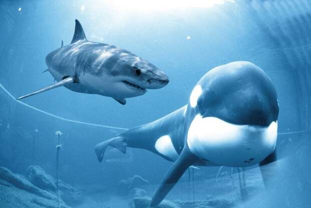 Съемочная группа National Geographic запечатлела как косатка София, лидер стаи косаток, замечает плывущую поблизости большую белую акулу и "таранит" её.