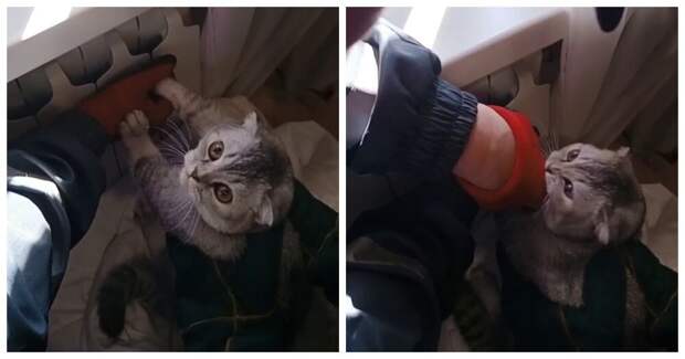 Малышка засунула лапу между ламелями, но пальчик застрял, и дальше всё пошло не по плану. Хозяйка попыталась освободить усыпанную амбициями активистку, но, не справившись, вызвала спасателей.