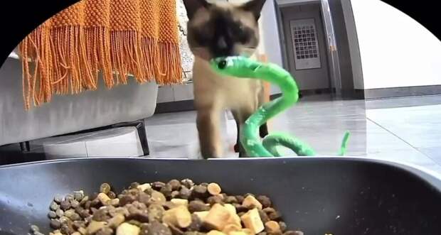 Домашняя кошка решила накормить любимую игрушку едой из миски.