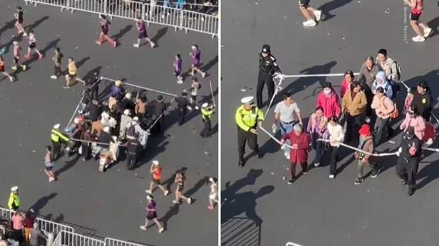 На Нанкинском марафоне 2025 года, который прошёл 16 ноября и собрал 24 000 спортсменов, организаторы применили оригинальное решение для безопасного перехода зрителей через переполненную беговую трассу.