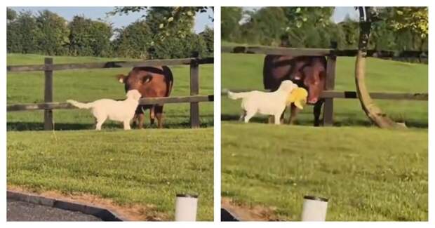 Пёс подружился с коровой. Автор запечатлел, как животные проявляют интерес друг к другу,