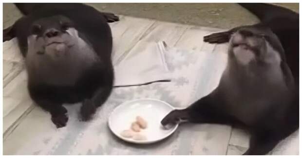 Сделайте перерыв и посмотрите, как выдры с большим аппетитом кушают морепродукты.