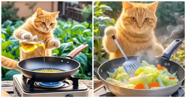 Нейросеть сгенерировала рыжего котика, который умеет готовить. На видео пушистый кулинар готовит несколько блюд, а потом ест их.