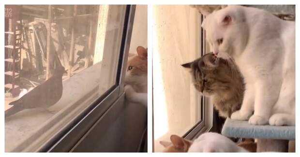 Пушистая банда внимательно следит за голубем за окном. Так близко, но так далеко!