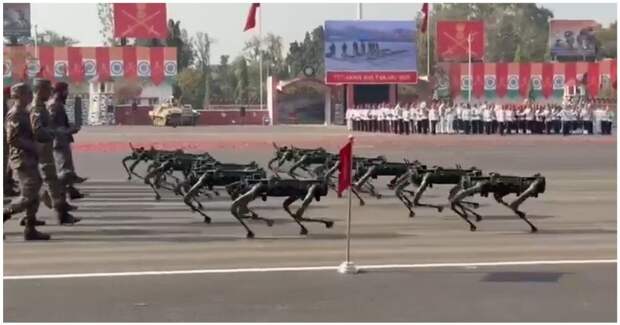 В Индии на параде, посвященному Дню армии, зрителям продемонстрируют робособак. На кадрах репетиция перед парадом.