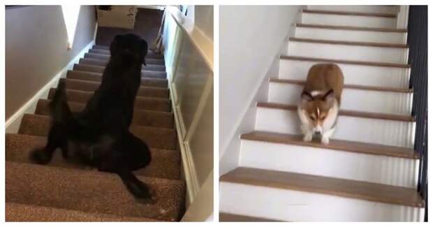 Домашние животные – главные герои многих весёлых видео в сети. Четвероногие герои данного ролика научились эффектно спускаться и подниматься по лестницам.