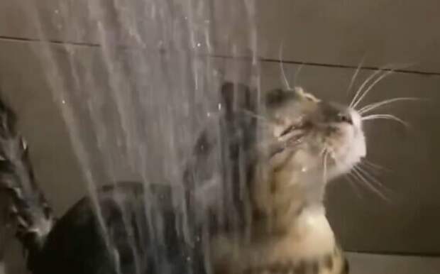 Большинство кошек и котов не любят водные процедуры. Однако среди них встречаются и исключения. Этот пушистый питомец с удовольствием принимает душ.