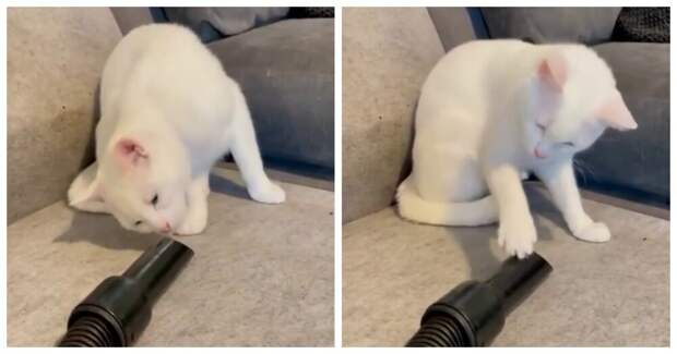 Кот заинтересовался шлангом работающего пылесоса. Питомец начал обнюхивать его и вскоре пожалел об этом.