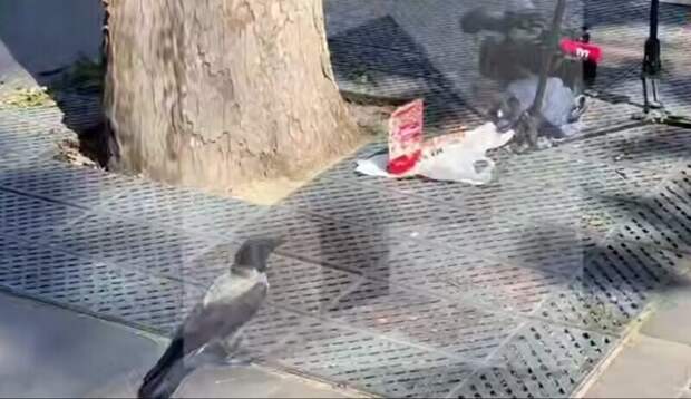 Ворона заприметила съемочную группу журналистов, собравшихся в Стамбуле. Пернатая любительница чужого добра выждала момент и схватила пачку орехов.