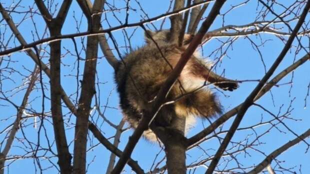 В Краснодаре енот забрался на высокое дерево, сидит там уже несколько дней и не может спуститься сам.