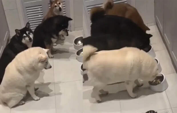 Хозяйка научила своих собак ждать, пока к своей миске не подойдет самый маленький обитатель дома.