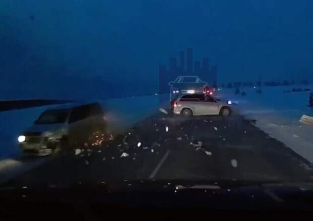 ДТП произошло на трассе в Красноярском крае. Водитель белого атомобиля Тойота Рав4 не справился с управлением на скользкой дороге и столкнулся со встречным минивэном.