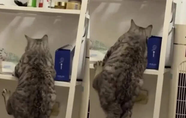 Девушка запечатлела неловкие попытки домашнего котика забраться на полку.