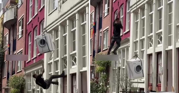Заказчик показывает, как с окна спускают стиральную машину на верёвке, которая явно тяжелее самого грузчика. Однако работник так ловко управляет спуском, словно Человек‑Паук в рабочей форме. Грузчик, балансируя, оказывается прямо на стене здания, словно спецназ на тренировке, и уверенно контролирует процесс.