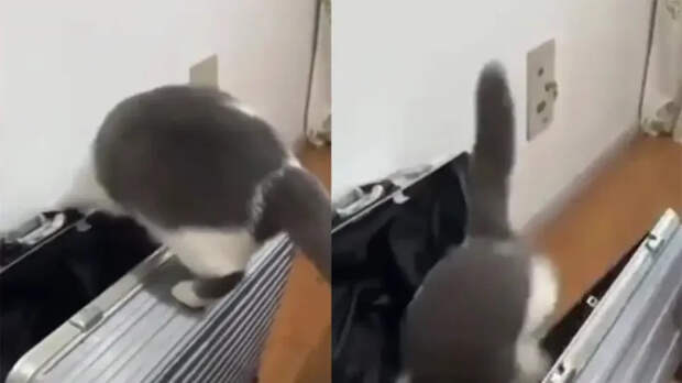 Любопытного кота заинтересовал чемодан хозяина, стоящий в коридоре. Питомец забрался на него и спустя мгновение оказался в ловушке.